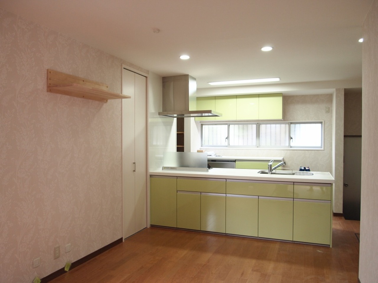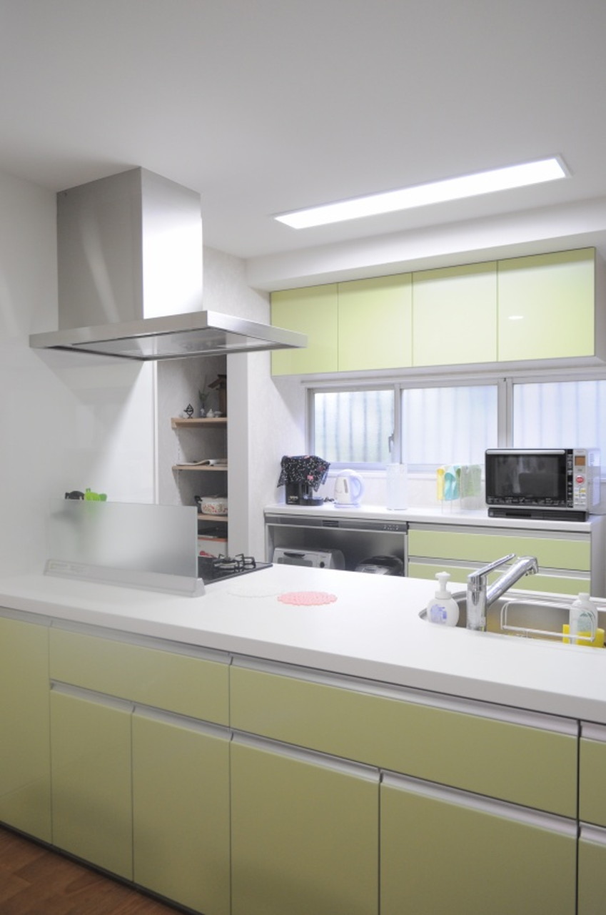 奥様ご希望の対面キッチンは鮮やかなグリーンで、室内のいいアクセントになっています。