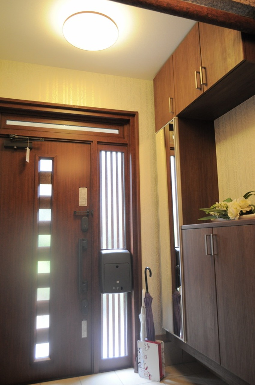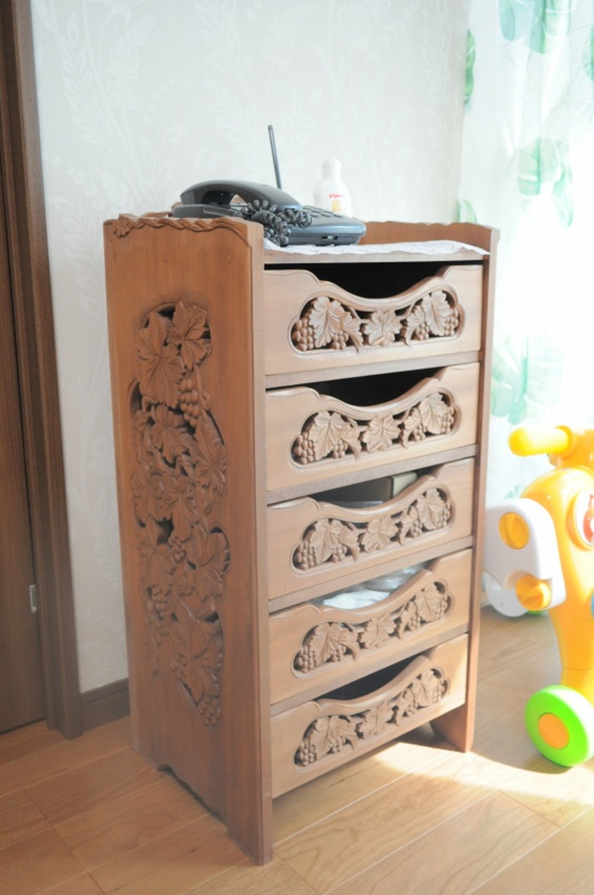カーテンや照明はリーフ模様にされ、奥様手作りの木彫りの電話台もコーディネートされました。