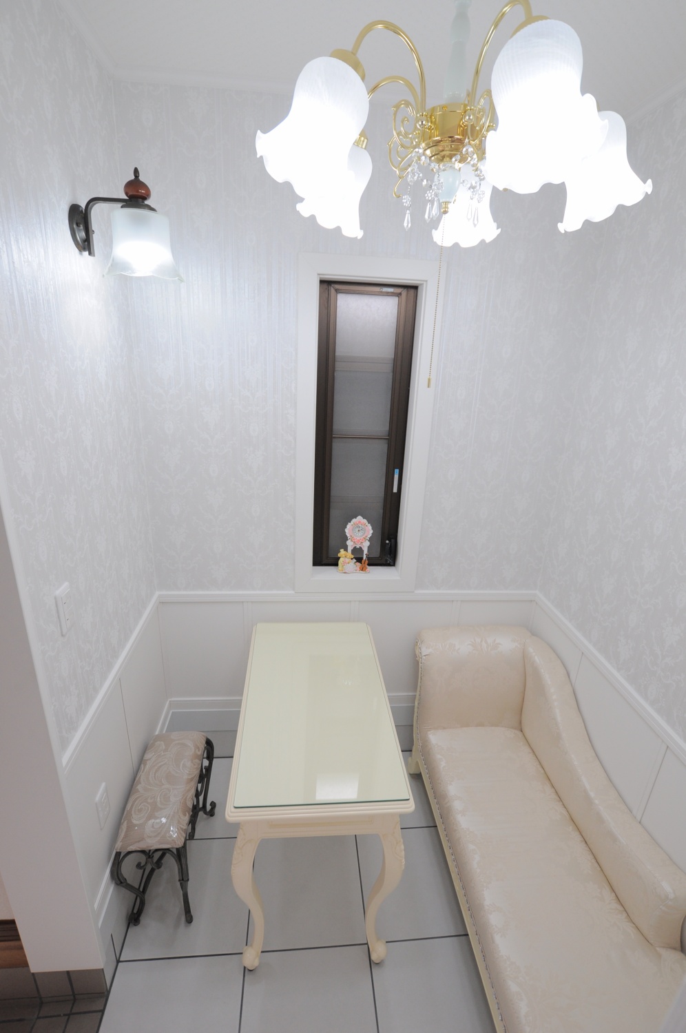 まず、来客スペースのイメージは【姫系】インテリアということで、【姫系】といえば、削ぎ落としたシンプルデザインとは逆で装飾していく感じに、白い腰壁パネルをつけ、もともとお風呂の窓だった縦長の窓も残し、そこに白い額縁 をつけました。